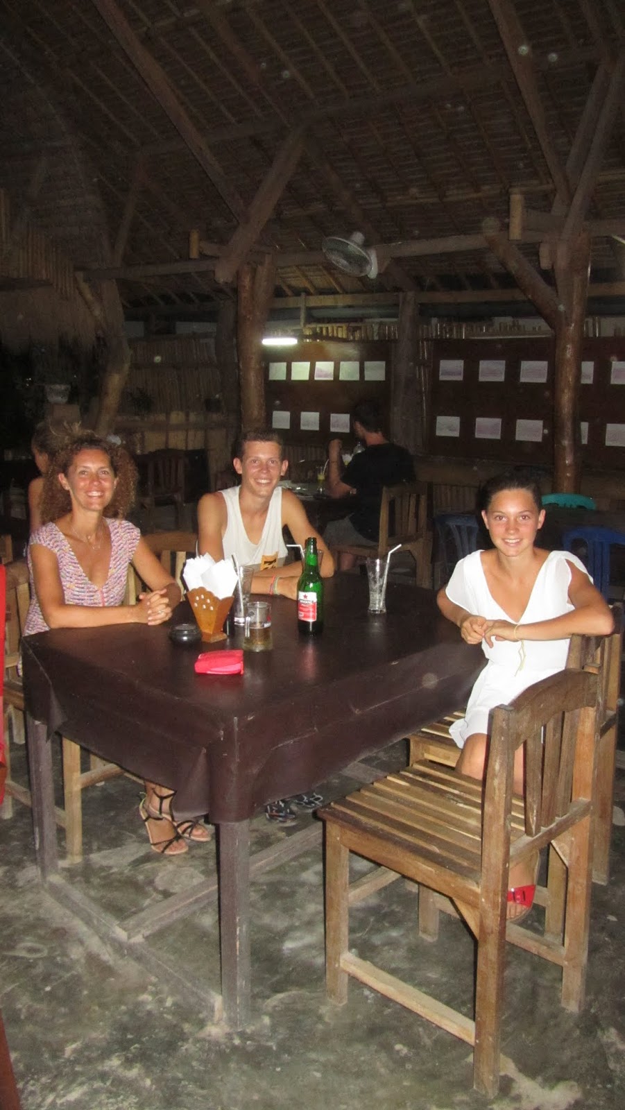 Nous squattons un beruga (abri extérieur en bambou) pour déguster un riz au poulet acheté à un vendeur ambulant. C'est l'occasion de partager un moment d'hilarité familiale car nous sommes obligés de véritablement cracher notre repas quand nous nous apercevons qu'il est extrêmement pimenté et immangeable pour des européens. Nous nous rendons même compte que les surfeurs autour de nous sont morts de rire : ils ont eux aussi tenté la nourriture du même stand et ont dû abandonner. Même le chien errant n'en veut pas !!!