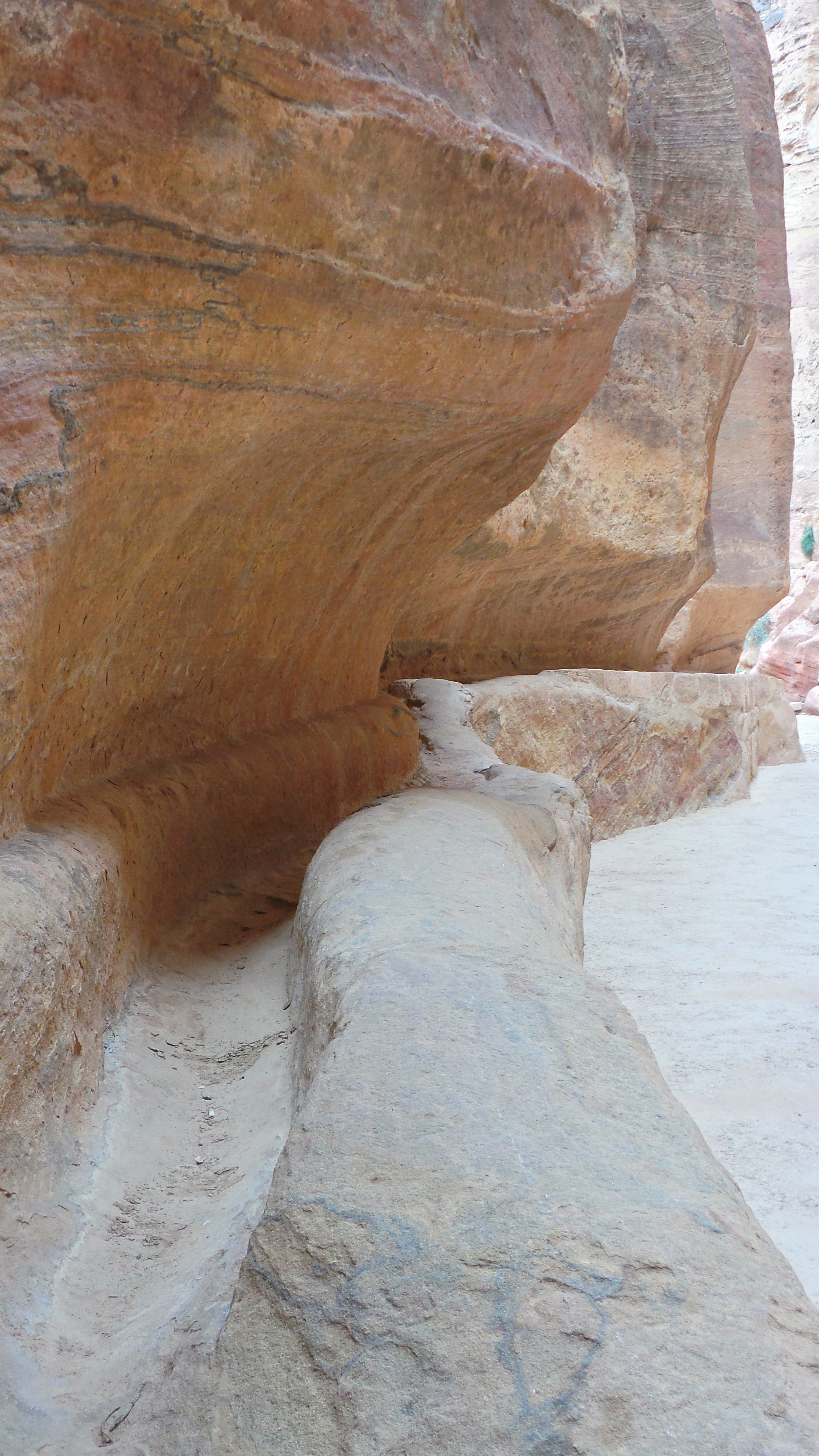 De chaque côté on peut voir les restes d’une canalisation creusée dans la roche qui permettait à l'époque nabatéenne de transporter l’eau de la source Aïn Braq vers le centre de Petra. Quelques gravures creusées à même la roche peuvent aussi être observées.